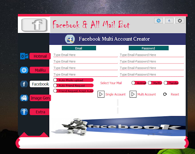 - Create accounts automatically in more than 10 places, including Hotmail, Facebook and many more